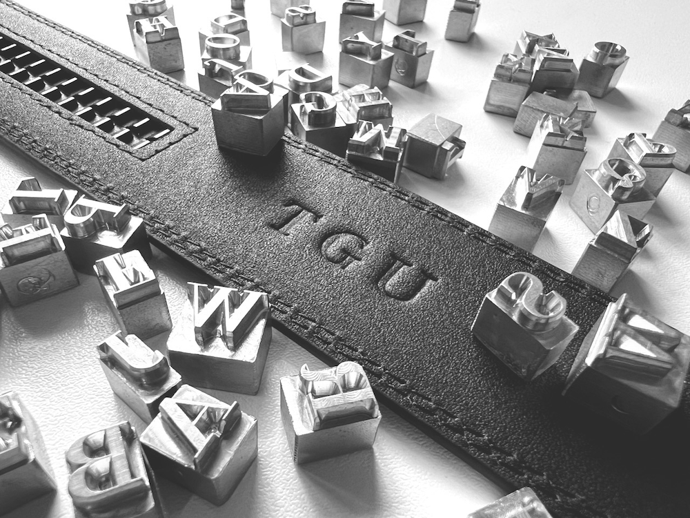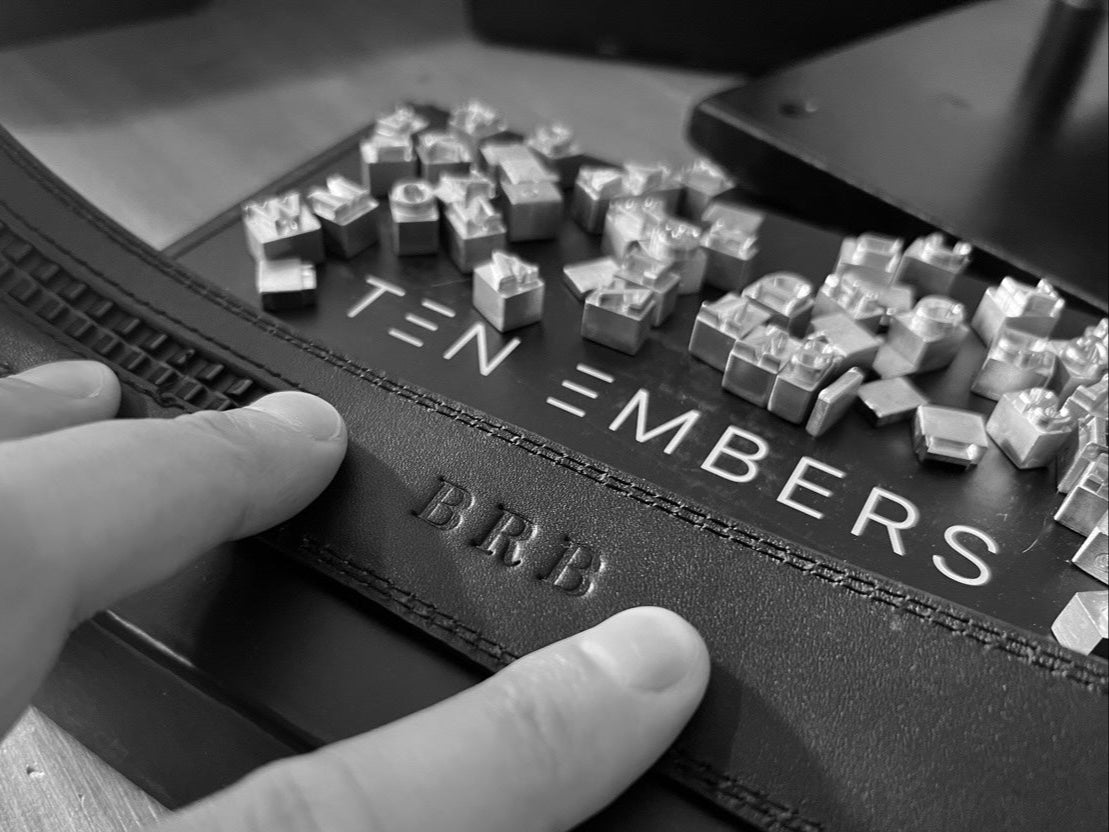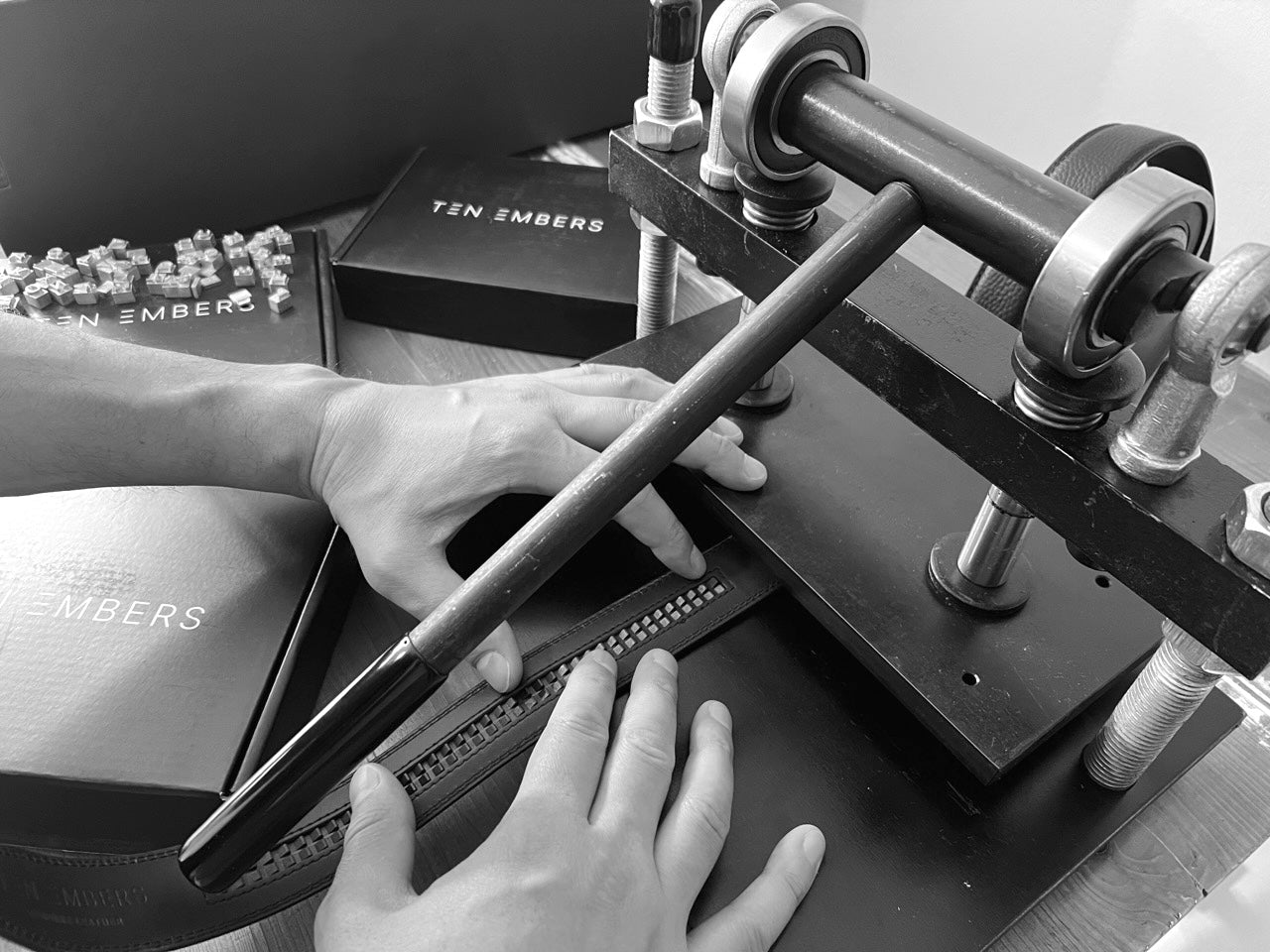 Your belt will be hand-stamped on the inside side of the leather, next to the ratchet grooves (on the opposite side of the ratchet to the Ten Embers logo). This location is discrete and will not be affected when you re-size your belt. All belts are hand-stamped in our London atelier by our leather experts.
